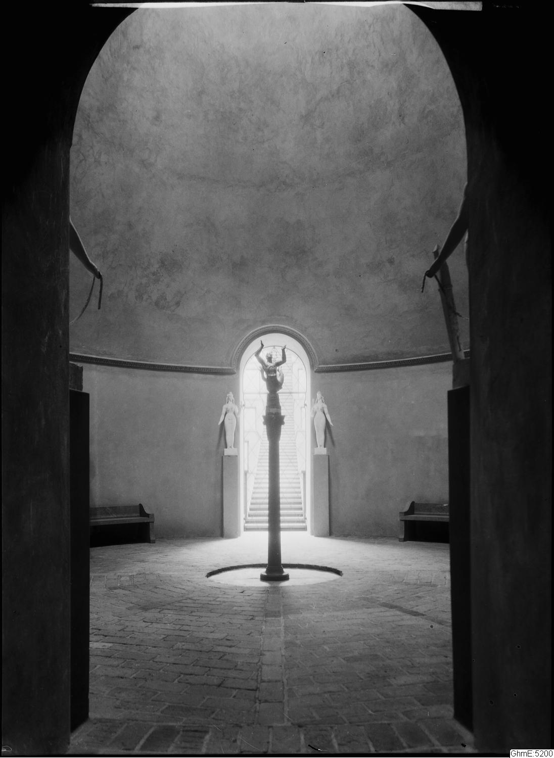 Jubileumsutställningen 1923. Entrén till Eldbegängelseföreningens utställning, i bakgrunden trappan upp till krematoriet.