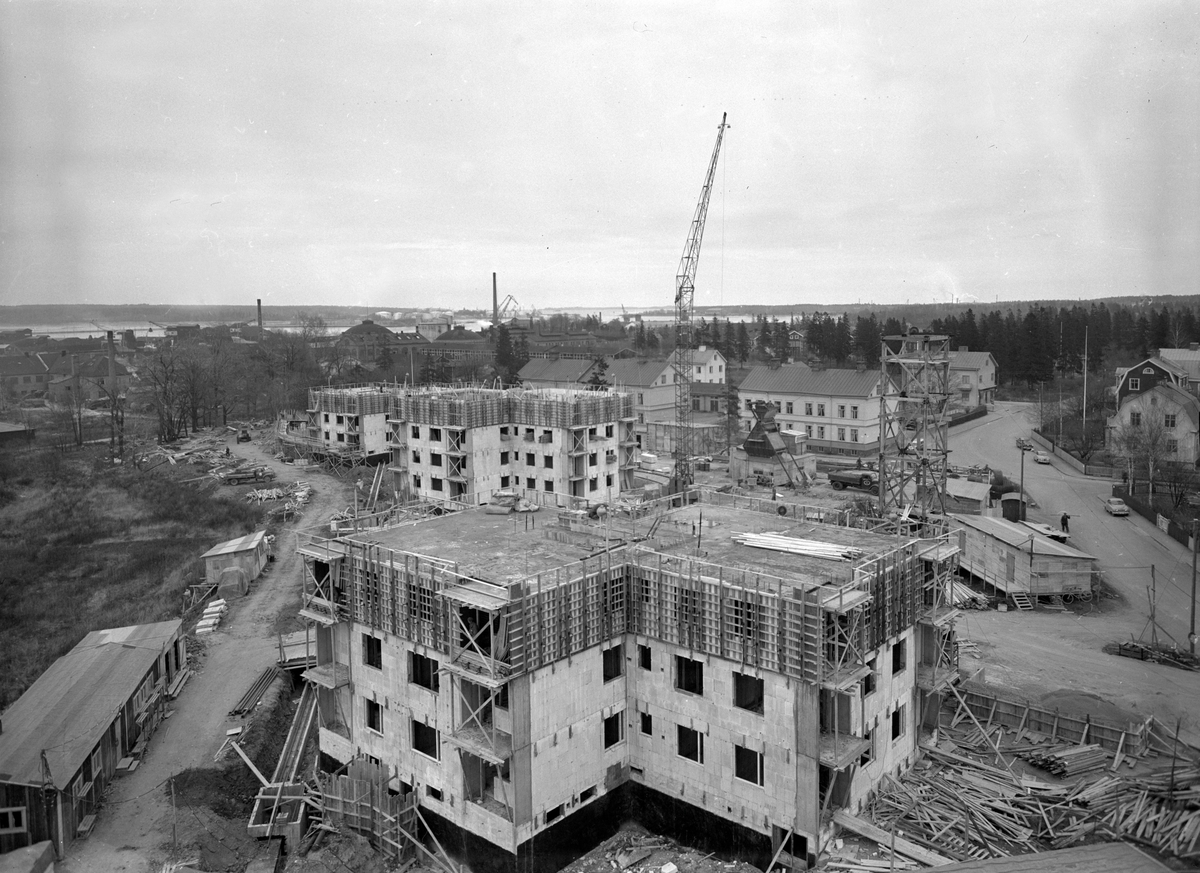 Pågående bygge på Brynäs, 1956. Byggnadsgille Uppsala - Gävle.