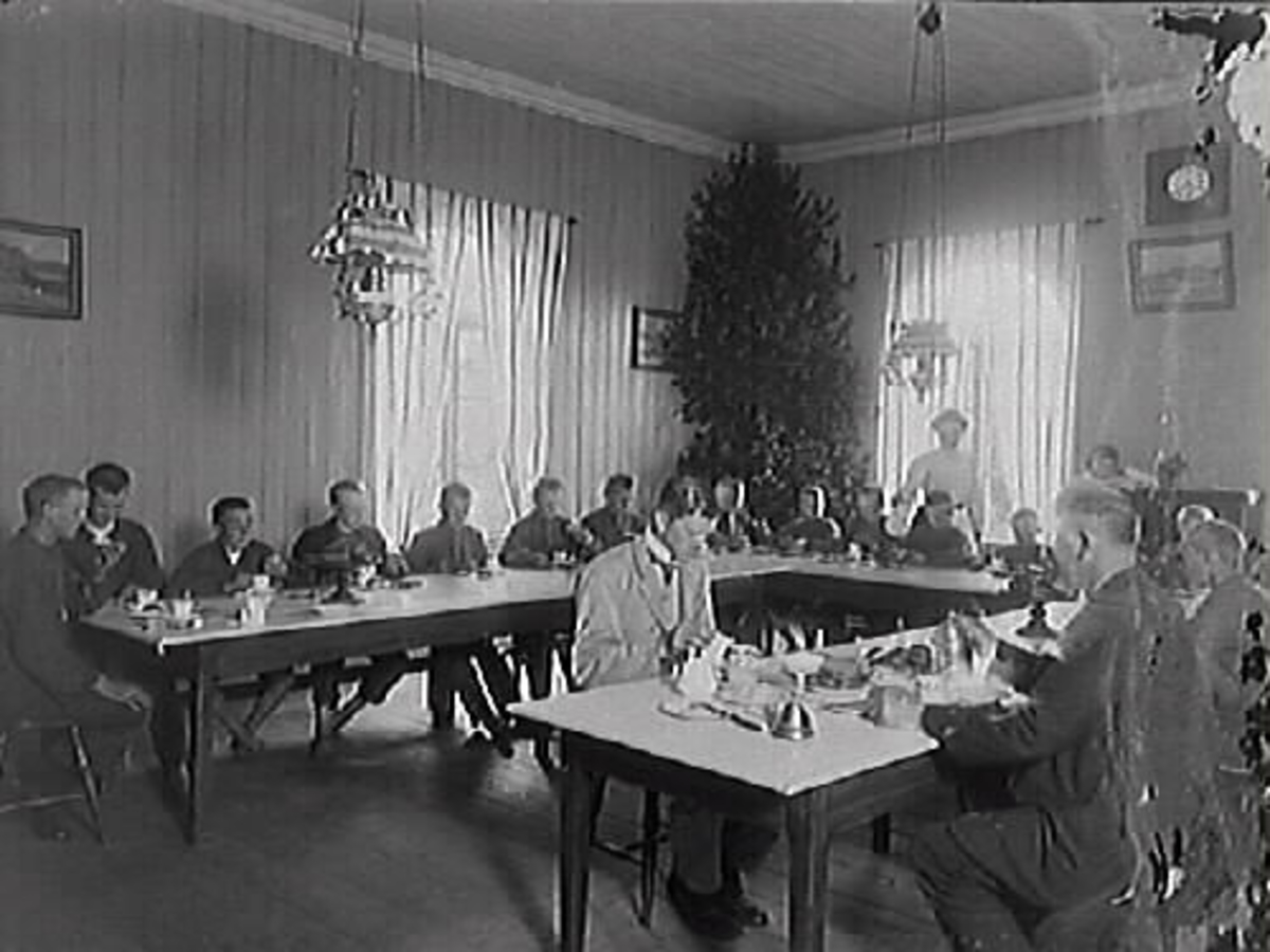 Måltid på skyddshemmet Mäshult. Ett 15-tal pojkar sitter vid bordet. Närmast kameran sitter två män. Framför fönstret står en kvinna och i hörnet en rumshög julgran (?). I taket hänger två fotogenlampor.
