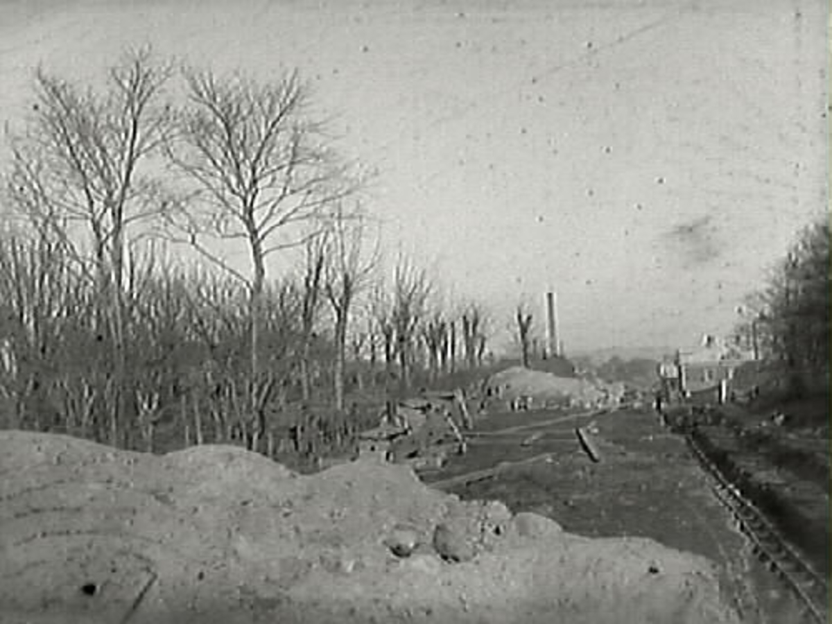 Omläggning av järnvägen inom Varbergs stad. Vy längs banan. I schaktet ligger räls för vagnar som används av järnvägsbyggarna. Stadsbebyggelse på långt avstånd. En person som står på spåret kan anas. I bakgrunden syns kraftverkets skorsten.