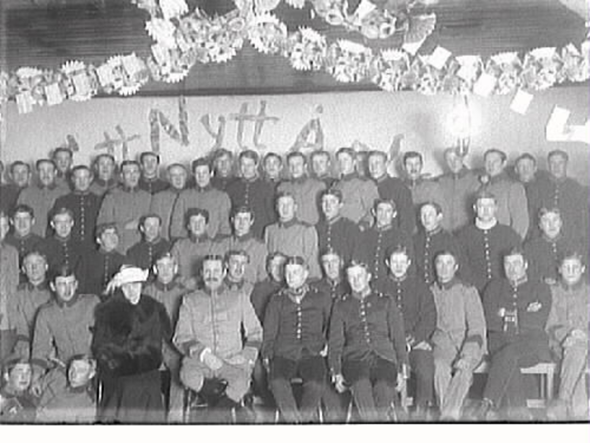 Nyårsfest på fästningen. Militärer, klädda i olika typer av uniformer. På den främre raden sitter en kvinna. Hon har pälsmuff och pälsboa. Vid hennes sida en stram man med mustach (maken?)