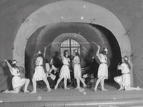 Teaterföreställning, nyårsrevyn "Valkyrior". En scen med stridande kvinnor framför män vid ett bord.