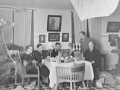 Julfirande hos fotograf Gustaf Björkström med familjen samlad runt ett bord och julgranen till vänster. Åren 1933-1937 bodde de i kv Gästgivaren. På golvet ligger papper efter julklappsöppnandet. Troligen är fotot taget med självutlösare eftersom Gustaf själv är med på bilden. Från vänster: Ulla Björkström, frun Märta Björkström, Åke Björkström med hustrun Elin Björkström, Gustaf Björkström och Bo Björkström.