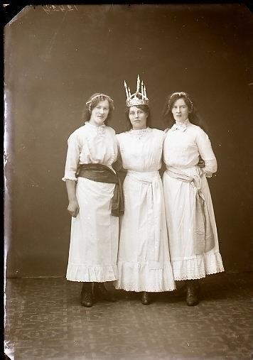 Ateljébild av Lucia med två tärnor stående i helbild. Fotografen har noterat: Trafikchef Collin. Beställare: Ida Johansson. (Se även bild GB2_5557)