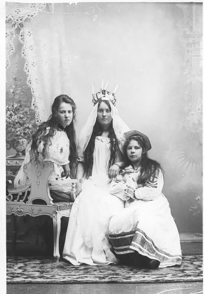 Ateljéfoto. Tre unga kvinnor flickor på en soffa, där den i mitten är klädd till Lussebrud.