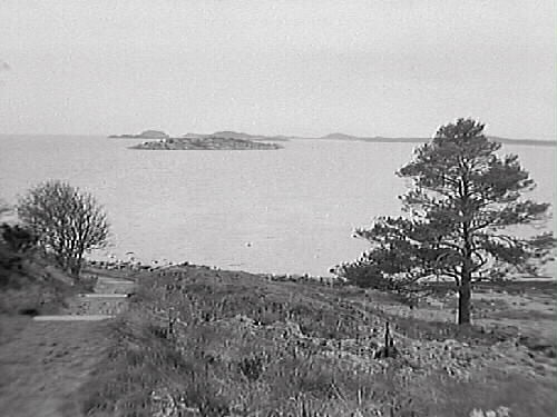 Vy över Kungsbackafjorden från Tjolöholms slott. Promenadvägen leder ner mot nuvarande badplats och hamn.