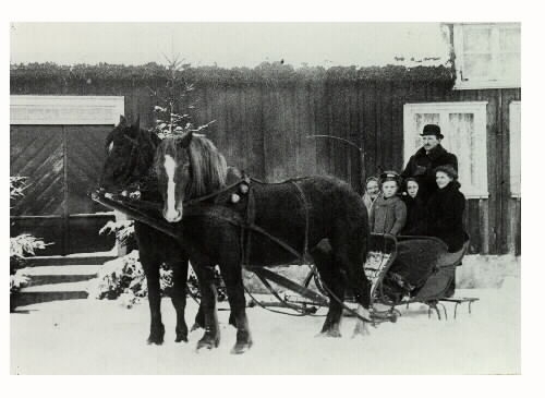 Karin Johansson, den lilla flickan, på besök hos sin mormor Augusta Bengtsson och morbrodern Alfred Bengtsson, som ägde gården Sven-Tors i Vare, Träslöv. Dessutom sitter två pigor i släden. Kortet är taget vid jul 1911 av en kringresande fotograf. Huset innehöll 5 stora rum och två kök.