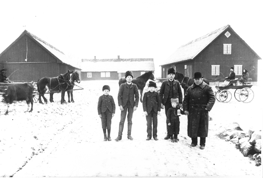 Gården Berg i Ugglarp år 1886. Anders, Gustav, Karl, Birger och lille Johan med mors porträtt på rocken, samt Patron på Berg, alla med efternamnet Gustavsson. I en hästdragen vagn sitter tjänstefolket Karolina och Sven-August. På sidan om vägen står en ko och en vagn med ett par hästar. En man sitter på kuskbocken. Det är vinter och lite snö på marken.
