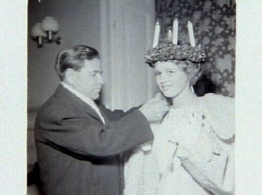 Varbergs Lucia 1958, Berit Johansson, krönes av pastor Eriksson. Artikel i samband med bilden publicerad i Varbergs Tidning 1958-12-15.