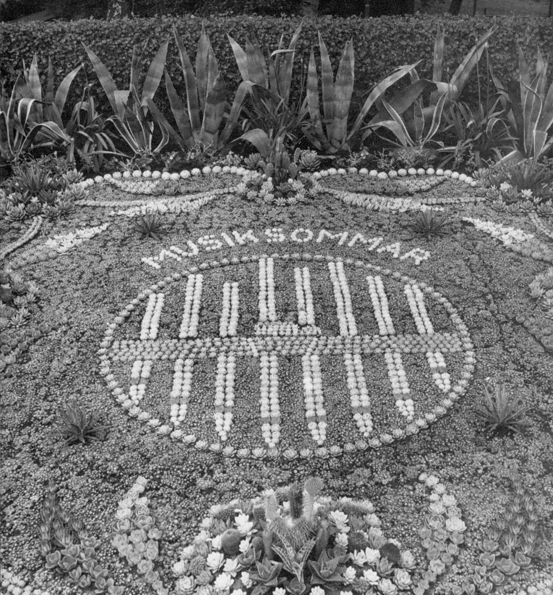 Bild i tidningsartikel med detalj ur kaktusplanteringen 1969 i Varbergs järnvägspark med en medaljong krönt av texten "Musiksommar". Bildtext: "Musiksymbol sommarens motiv i järnvägsparkens kaktusplantering."