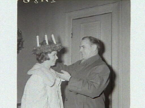 Lilian Johansson, 1960 års Lucia, med tärnor. Artikel i samband med bilderna publicerad i Varbergs Tidning 1960-12-12.