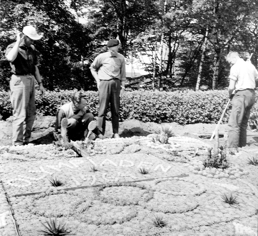Kaktusplanteringen i Järnvägsparken år 1964. Årets motiv visar de olympiska ringarna under texten "Olympiaden 1964". Bildtext: "Sommarattraktion i vardande. Stadsträdgårdsmästare Oscar Johansson (i basker) och medhjälpare."