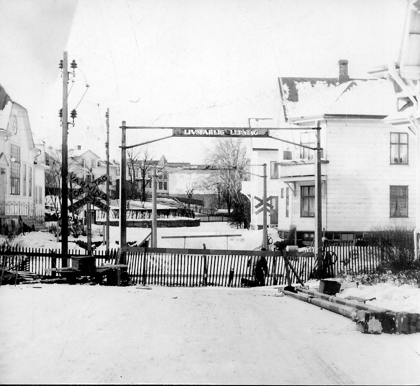 Bommarna vid järnvägskorsningen på Bäckgatan har ersatts med ett staket. Till vänster, på andra sidan spåret, syns Missionskyrkan i kv Skepparen.