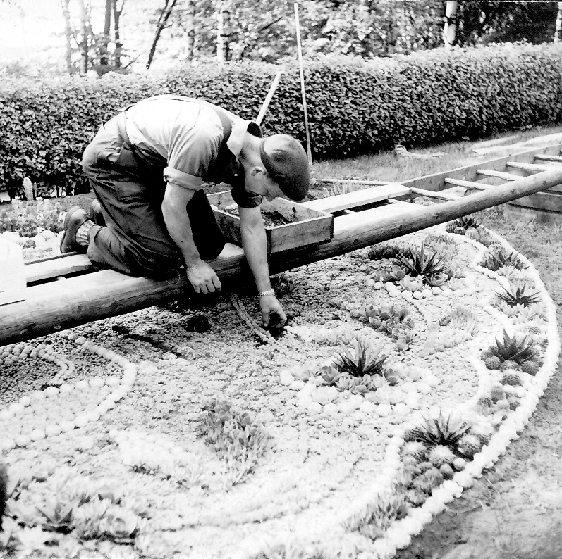 Trädgårdsmästare Sören Pettersson planterar kaktusar i järnvägsparken.