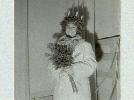 Kröning av 1961 års Lucia, Marianne Lindblom, erhåller Luciasmycket av museichefen Bengt-Arne Person. Artikel i samband med bilderna publicerad i Varbergs Tidning 1961-12-15.