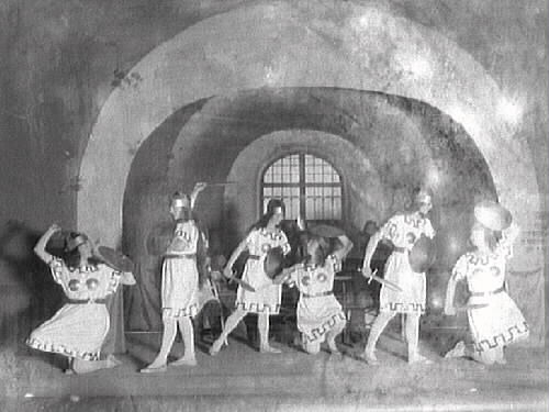 Teaterföreställning, nyårsrevyn "Valkyrior". Scen med stridande kvinnor med svärd och sköldar.