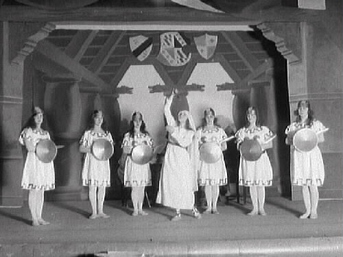 Teaterföreställning. Nyårsrevyn "Valkyrior". En rad med sköldförsedda kvinnor står bakom en kvinna som förefaller dansa.