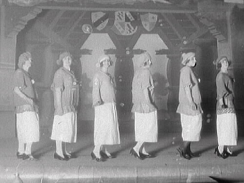 Teaterföreställning, nyårsrevyn "Jazzflickor", en scen med sex flickor på rad med ena sidan vänd åt publiken. Bild 2 visar en grupp svartklädda människor i ett finrum med girlander i taklampan.