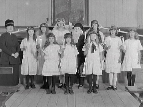 Luciafirande hos frälsningsarmén med "Lussebrud", i slöja, en tomte bredvid henne och tärnor. Lokalen låg i hörnet Kykogatan-Östra Långgatan. Personerna är från vänster, bakre raden: Kapten Frida Bergström, Daga Ek, Inga Pihl, Gunborg Åsén, tomte okänd, Greta Åsén, Tyra Antonsson, Hagar Antonsson. Främre raden:Sally Andersson, Inga-Lisa Wennberg, Ragna Pihl.