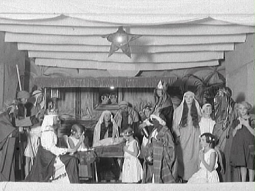 Teaterföreställning med en strålande stjärna över scenen i krubban. "Julspel framfört av elever ur skilda årsklasser. Längst till vänster, en av herdarna, är dr Elsa Köhler, tyskalärarinna som brukade dra igång de här teaterevenemangen. Bredvid henne (syns bara ett vitt ben) står Ingegerd Estvall; bedjande ängel är Gunnel Larsson; 'Maria' vid krubban är Kerstin Linton; ängeln på knä är Sylvia Carlsson; det lilla ansiktet som tittar fram bakom den knäböjande vise mannen är Kerstin Johansson; den långe 'vise mannen' bredvid är Margit Lütz; bedjande ängeln som sitter på knä på högerkanten är Karin Hallengren; den lilla flickan bakom henne i vita kläder heter Karin Ottander; flickan längst ut till höger är Majken Björk-Nyman."