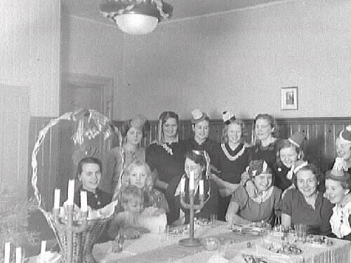 Julfest för 8:e klass i Flickskolan i ett julpyntat rum med väggbröstning. Ett litet barn deltar också och alla är samlade i små partyhattar vid bordsänden. (Se även bild GB2_3678)