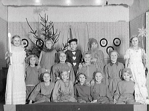 Barnen är 11 år gamla och har just uppfört ett julspel för föräldrar och släktingar, vid jul på Flickskolans teater. Lärarinna var Ruth Eriksson. Stående från vänster: Inga Svensson, Kerstin Svensson, Irene Carlsson, Birgit Roos, Mary Byfält. Mellersta raden från vänster: Gunvor Bengtsson, Birgit Lindberg, Birgit Svensson, Ulla Östlund. Längst fram, från vänster: Karin Larsson, Anne Maj Grangeus, Marianne Börjesson, Siv Christoffersson, Margret Mårtensson. (Se även bild GB2_3698)