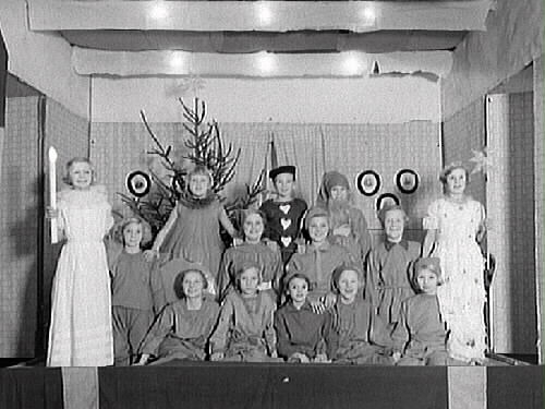 Barnen är 11 år gamla och har just uppfört ett julspel för föräldrar och släktingar, vid jul på Flickskolans teater. Lärarinna var Ruth Eriksson. Stående från vänster: Inga Svensson, Kerstin Svensson, Irene Carlsson, Birgit Roos, Mary Byfält. Mellersta raden från vänster: Gunvor Bengtsson, Birgit Lindberg, Birgit Svensson, Ulla Östlund. Längst fram, från vänster: Karin Larsson, Anne Maj Grangeus, Marianne Börjesson, Siv Christoffersson, Margret Mårtensson. (Se även bild GB2_3696)