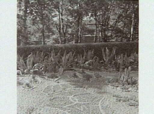 Kung Gustaf VI Adolfs namnchiffer i kaktusplanteringen i Varbergs järnvägspark med anledning av kungens besök i staden i juni. Artikel i samband med bilden publicerad i Varbergs Tidning 1954-06-09.