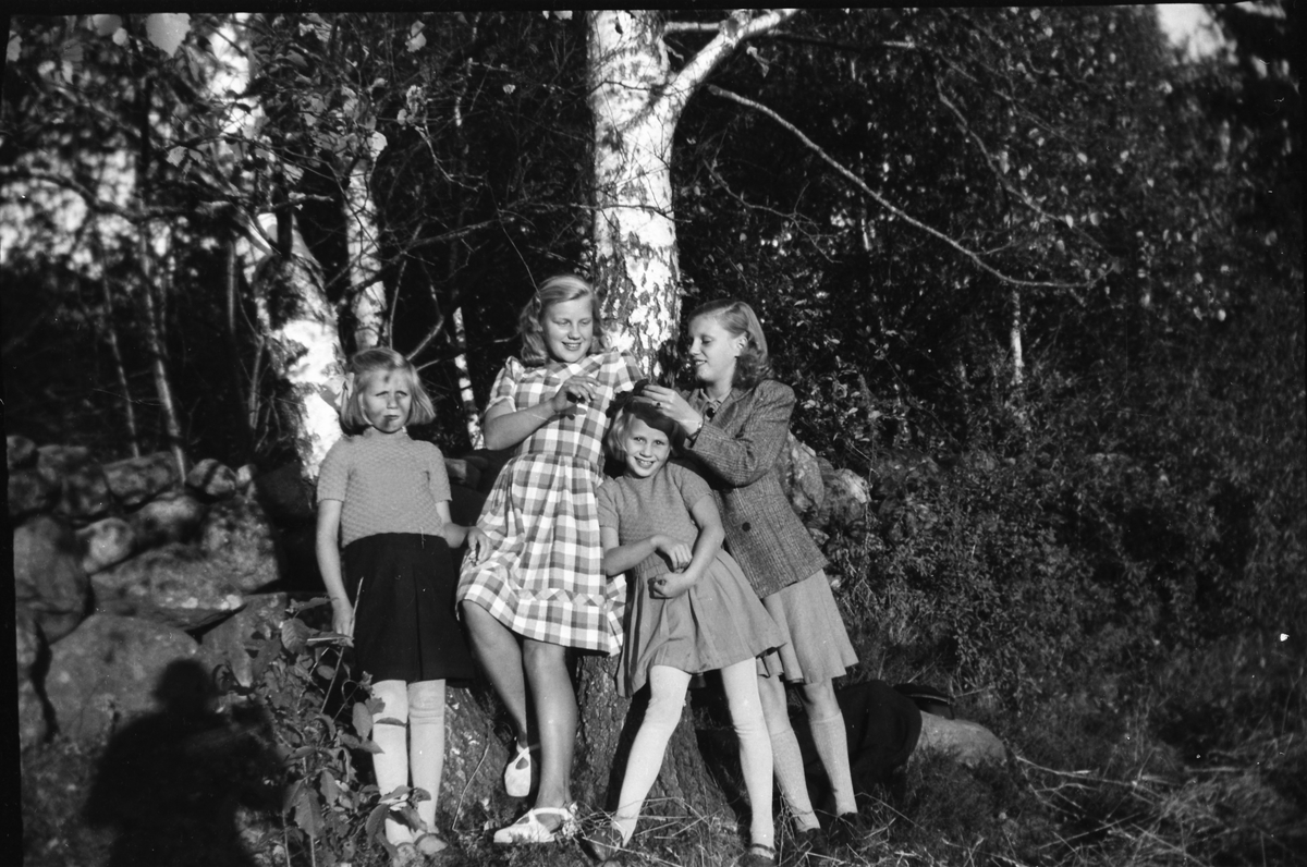 Molins fyra döttrar i Vabränna står vid några soliga björkar intill stenmuren och skojar med varandra. Till vänster syns Kloar-Eriks skugga fotografera.