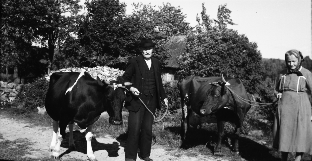 Herman och Anna i Planterhagen med två kor. I bakgrunden syns en stor vedtrave och ett uthus.