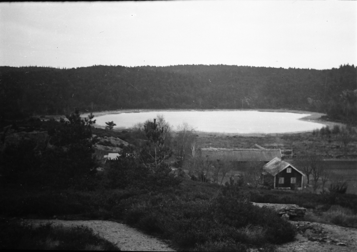 Vy över Barnasjö i Veddige (öster om väg 865) där kvartersishockey spelades före 1964. I förgrunden ligger en gård nedanför berget.