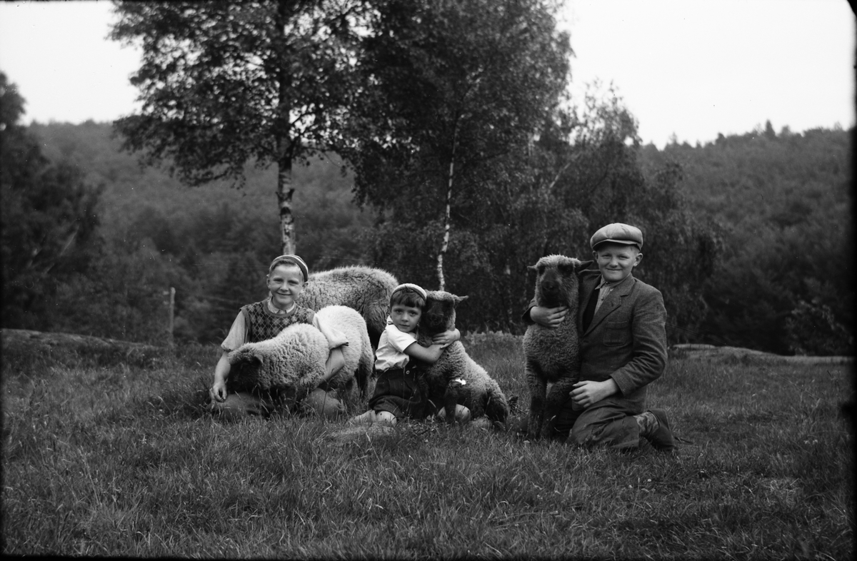 Tre pojkar sitter på en högt belägen äng och kramar varsitt får. Till höger "Erik på Heden (vid Björkholmen) som blev slaktare och snickare". De andra två pojkarna är bröderna Almer till höger och Karl-Erik Johansson från Sandlid.