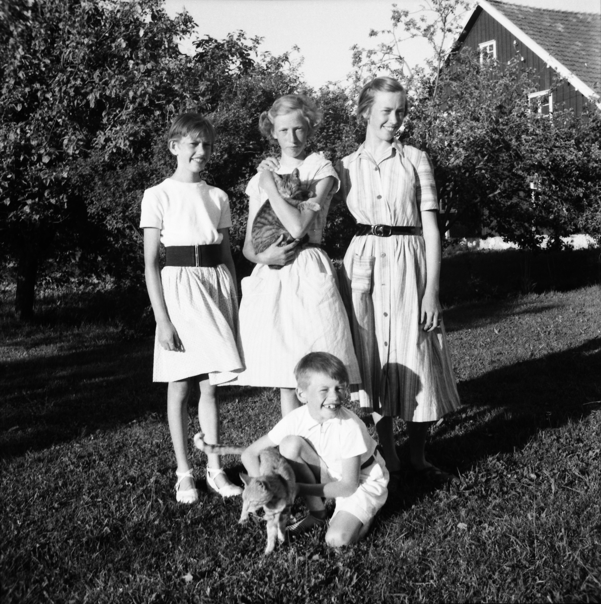 Fyra syskon Johansson med två katter i trädgården på gården Börs i byn Telnebacka, Veddige. Från vänster: Ulla, Gudrun, Barbro och Karl-Erik. Alla har skärp i midjan och Ullas är av högsta mode: ett brett resårskärp.