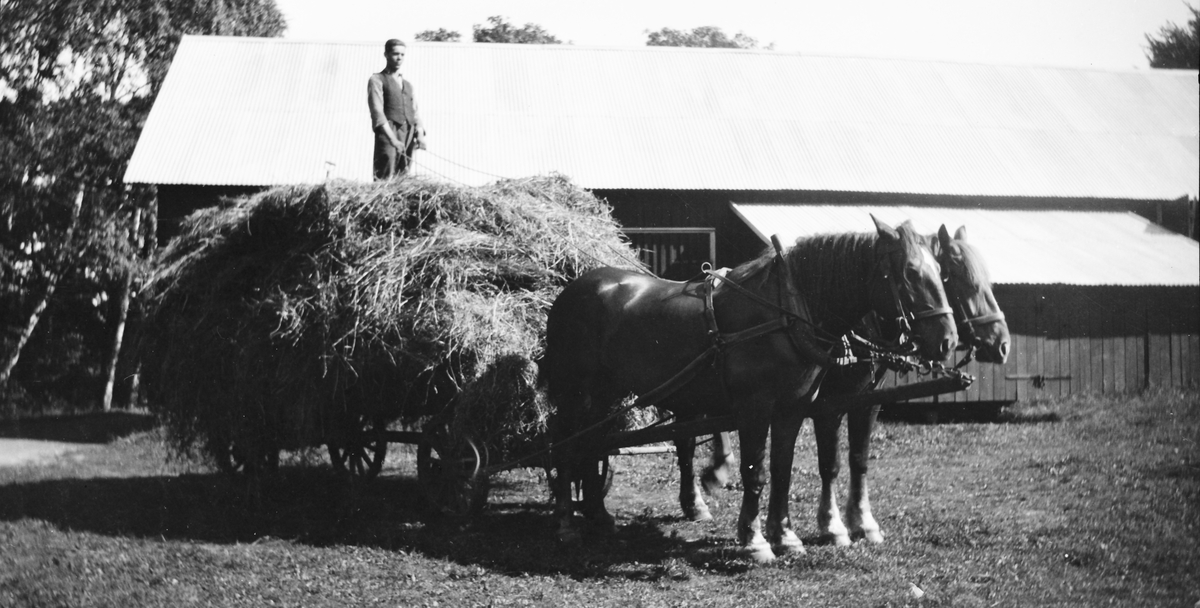 En ung kusk har kört in hölasset på gården med sitt tvåspann.