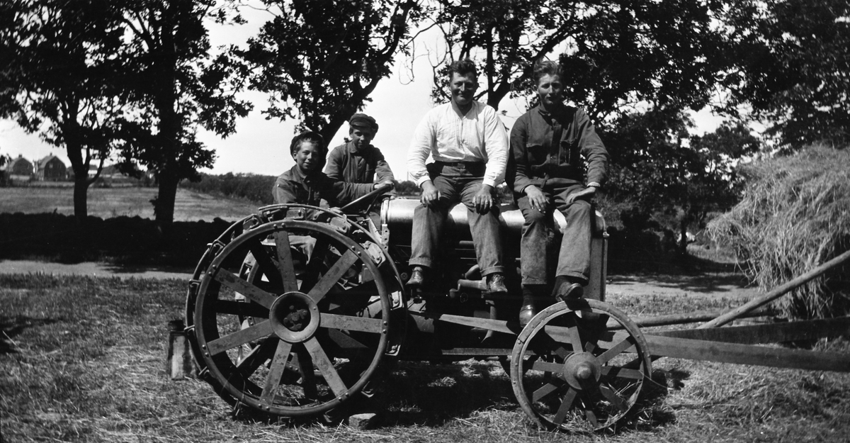 Två män och två pojkar sitter på en traktor med järnhjul, inköpt på Göteborgsutställningen 1923 och såld 1932 av Albin på gården Älekulla i Frillesås. Vid ratten sitter Albins son Knut och bredvid står hans bror Karl eller Evert. Den fjärde ynglingen heter William. I bakgrunden syns gårdsbebyggelse.