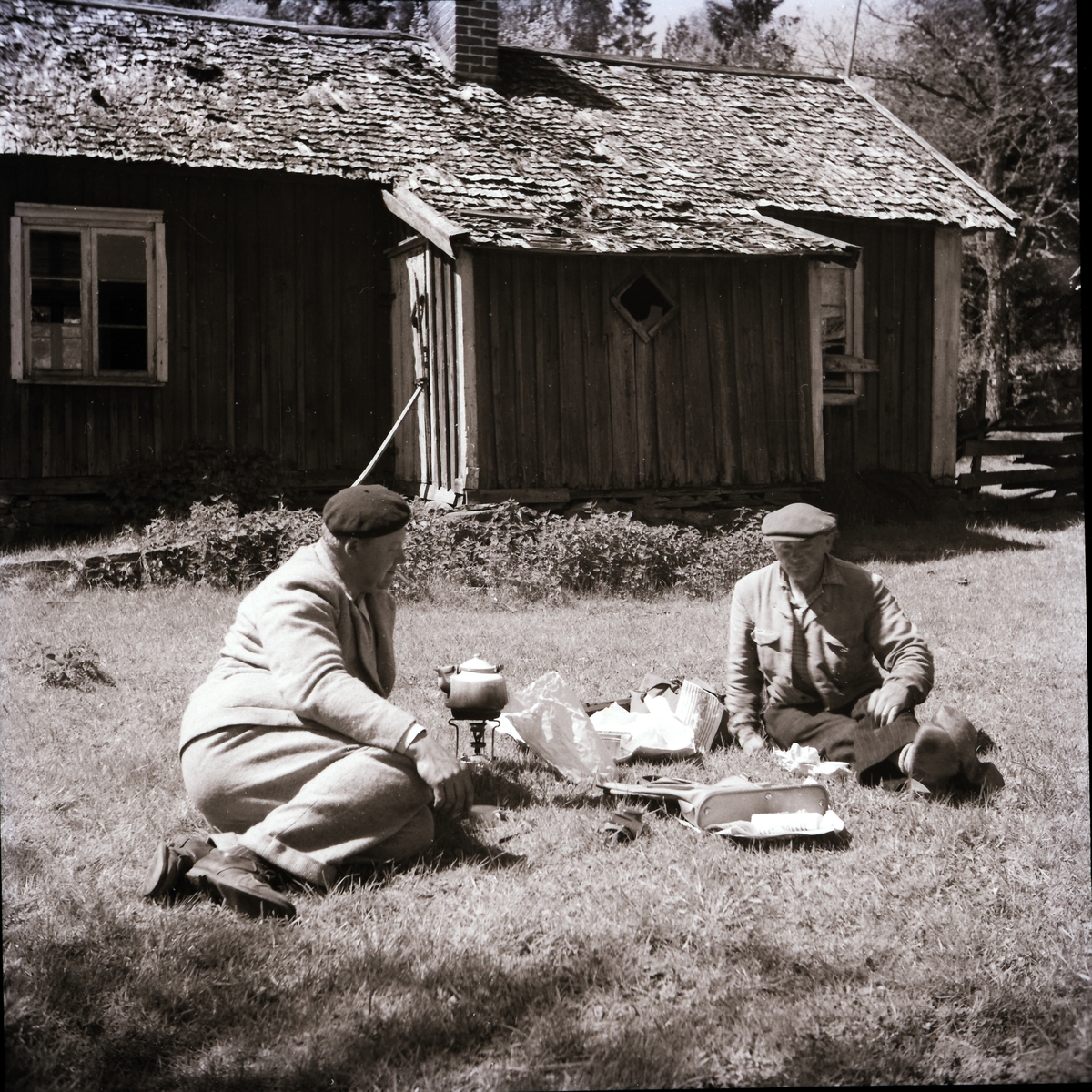 Kloar-Erik och Anders Lundgren sitter i gröngräset en stuga med sticktak/pärt, Dämmarehult, med kaffepanna på ett fotogenkök.