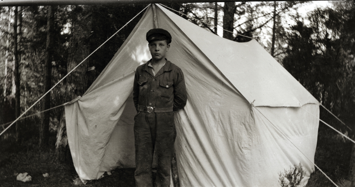 En pojke i overall och vegamössa står med armarna bakom ryggen framför ett tält i skogen.