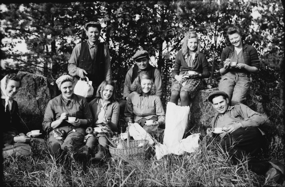 Kafferast i det gröna i Utmossen, Fageråkra. Vuxna och ungdomar sitter i gräset eller på en stor sten. Kaffeporslin, mjölkflaska, en rejäl kaffepanna och flera sorters bakverk, bland annat stora kringlor har dukats upp.