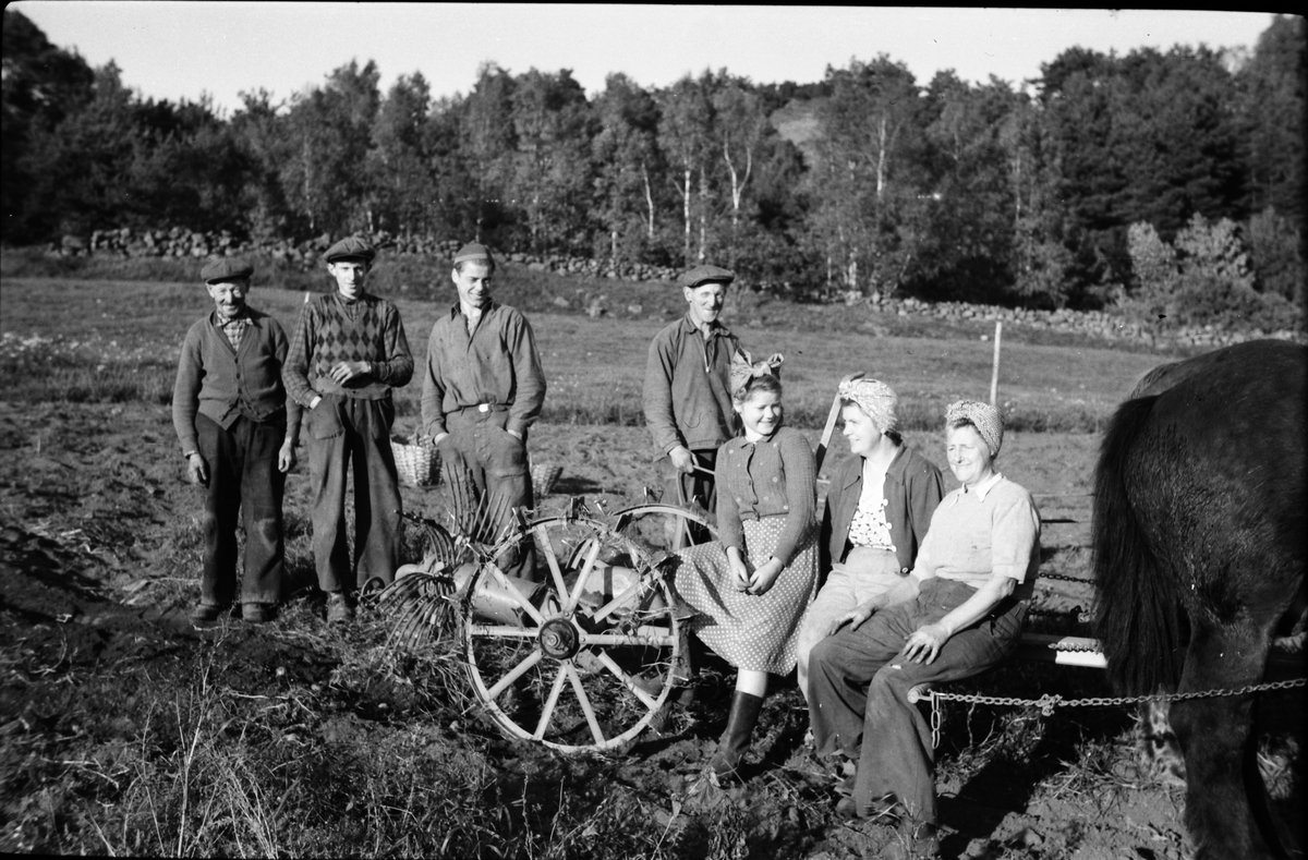 Potatisplockning en solig dag hos Snyggs August med fyra män, (Gunnar i Nykvarn längst till höger) som står vid en hästdragen potatissprätt. På sprätten sitter tre kvinnor, den mittersta heter Jenny Lidberg.
