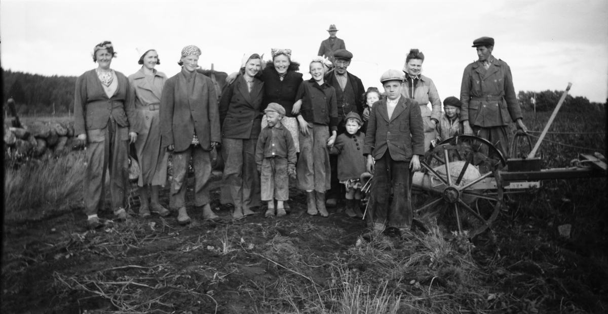 Familjen Snygg har pausat från potatisplockningen för fotografering på åkern - nio vuxna och sex barn. Karl Snygg håller i tömmarna längst till höger och den äldre mannen är August Snygg. Kvinnan i mitten är sannolikt Anna Snygg.