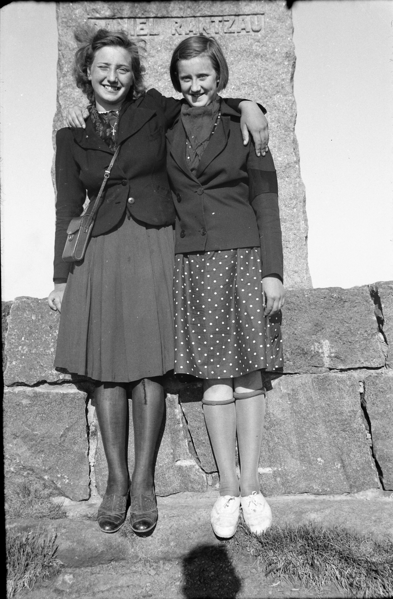 Två unga kvinnor vid Rantzaustenen på Rantzauklippan i Varberg.