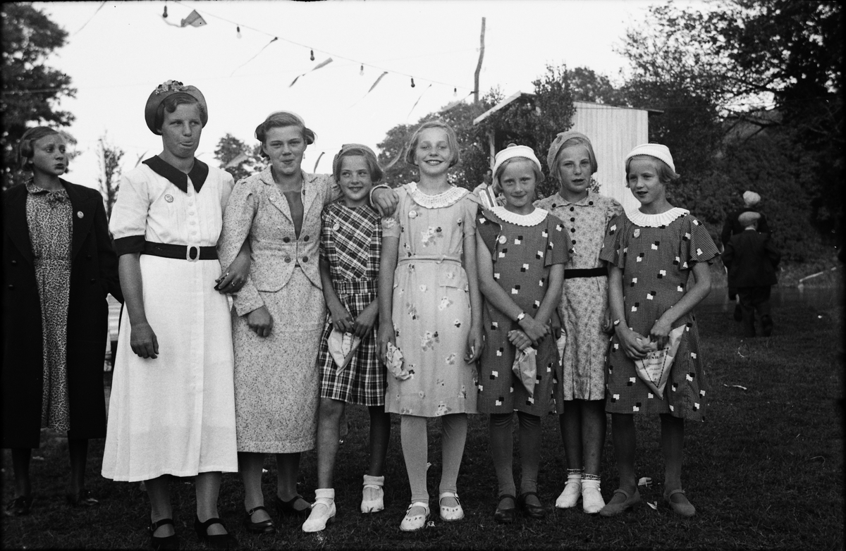 Åtta flickor uppradade framför en dansbana. Alla bär ett runt litet märke som troligen är knutet till festligheten. Några har godisstrutar i händerna. Två flickor är likadant klädda och har var sitt armbandsur. Kanske är det Inga och Anna-Greta Johansson som förutom Gunhild Thornell ska vara med på bilden. Kulörta lyktor och vimplar hänger över dansbanan och en dragspelare skymtas vid den lövade scenen och till höger om den ett par kepsklädda gossar.