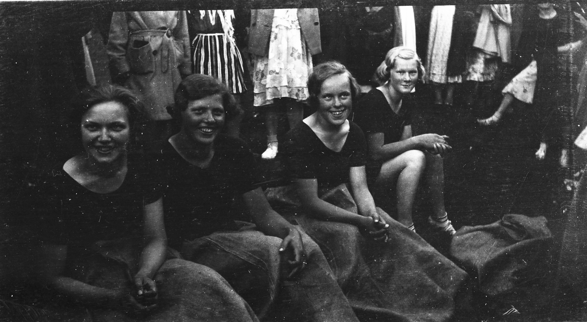 Fyra unga kvinnor i säcklöpningstävling sitter omgärdade av finklädd publik. Elin Sjögren i Vagnabäck sitter längst till höger med sin svägerska Elsa i Prästgården intill sig och sedan Lilly Sjögren i Tjärnmo och längst till vänster troligen Karin på Syllemad.