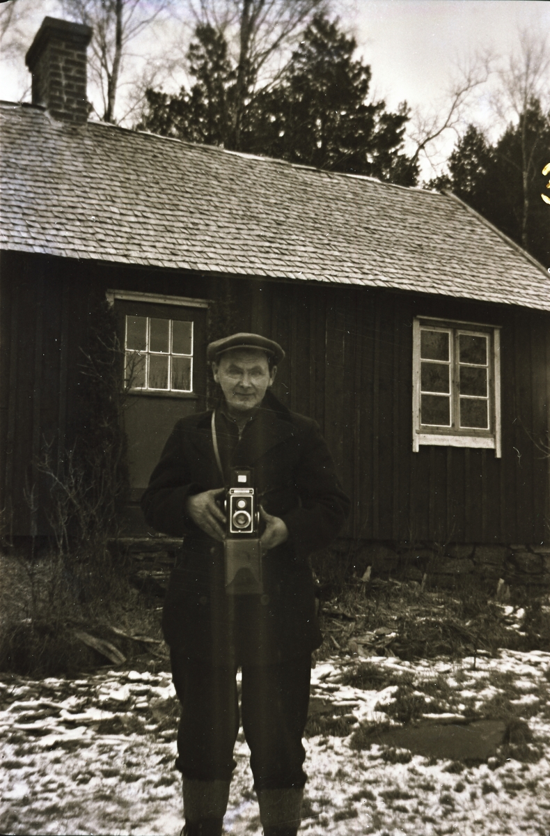 Erik "Kloar-Erik" Andersson står med kameran framför sin stuga i skogen. Marken är lätt snötäckt.