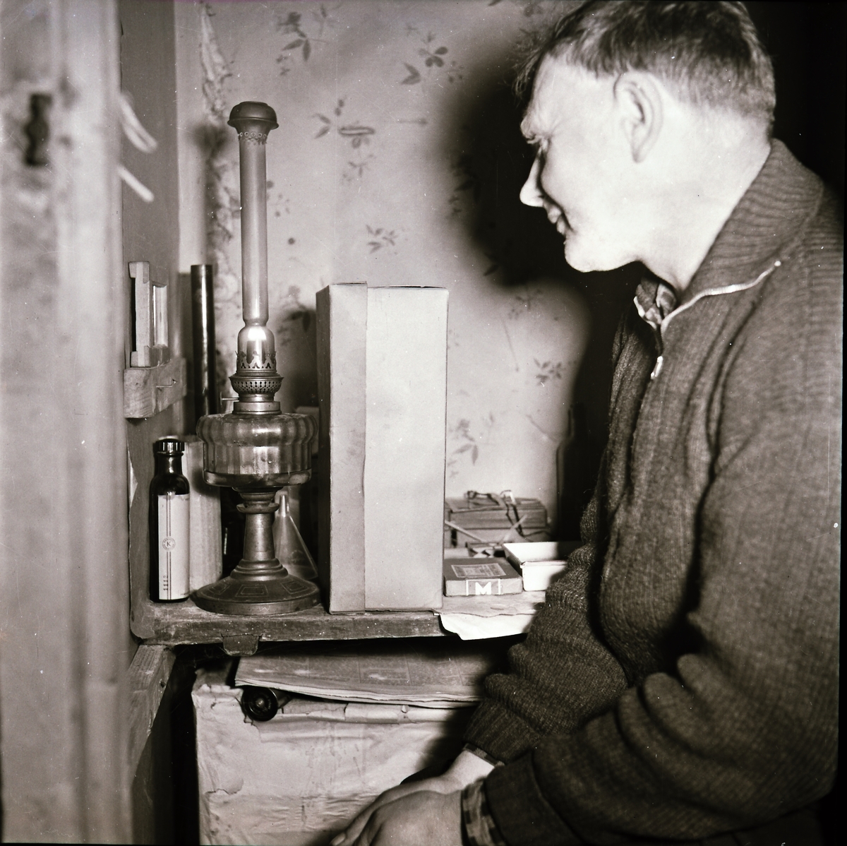 Kloar-Erik i sitt "mörkrum" med en 12-linjers fotogenlampa. ) Bredden på fotogenlamports veke mäts i linjer.) Bilden var publicerad i Hallands Nyheter 1953.