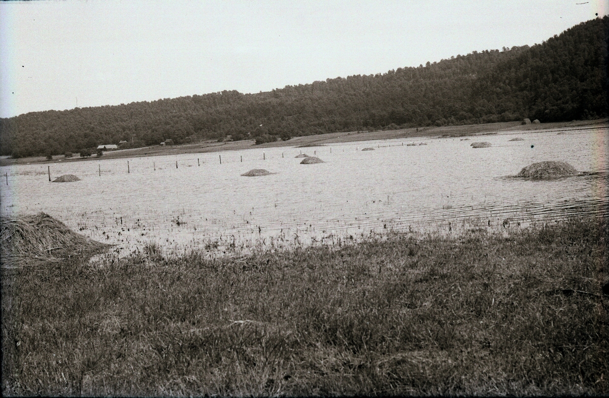 Översvämning av Veselången - en utdikad sjö på gränsen mellan Veddige i Halland och Horred i Västergötland. Höstackarna, som sticker upp ur vattnet, har inte hunnit bärgas i tid. Sjön Veselången sänktes 1855-1865 och blev då hälften så lång som tidigare. 1883 var den fortfarande sjö, då dess namn i ett lexikon ("Namn och bygd" av C M Rosenberg) beskrevs som stammande från 1300-talet (Uisulang) och kan tolkas som "långsjön i maden". Stammen anses vara vis-, som även finns i Viskan, och "visa" lär här betyda "fuktig ängsmark". Sjön har alltså dikats ut senare för att vinna odlingsmark, men fortfarande översvämmas dessa vid perioder med högt vattenflöde i Viskan, så Veselången återuppstår då i någon mening.