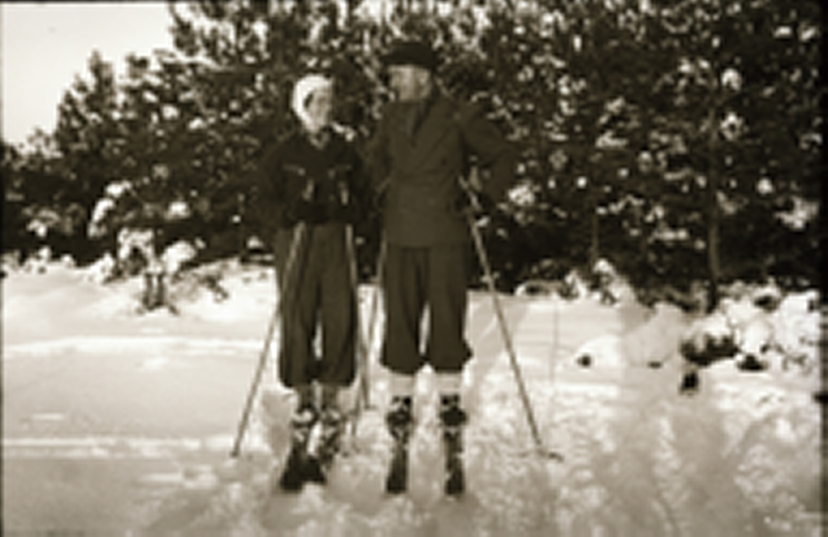 Vinterbild med Jenny och Karl Axel Lidberg (gården Albäck), förman på Jonsjö, poserar på skidor.