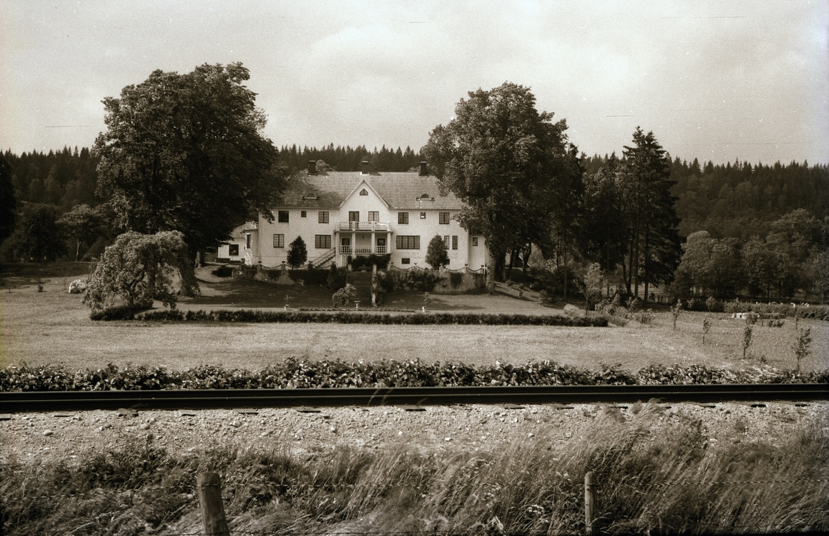 Jonsjö säteris huvudbyggnad, sedd från trädgården med järnvägsrälsen i förgrunden.