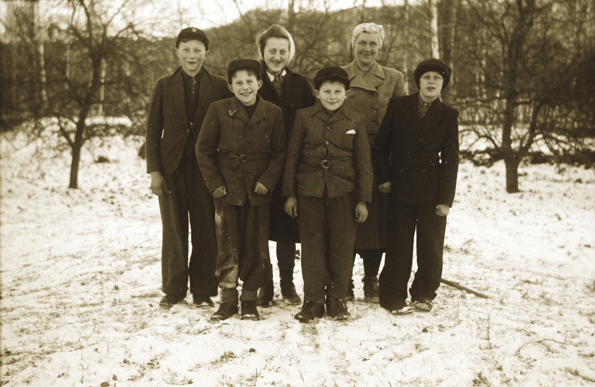 Hilma Håkansson i Dämmarhult tillsammans med sina fem barn framför Eriks kamera utomhus. Marken är snötäckt och en av pojkarna har lite snö på kläderna. (Se även bilderna EA0201, EA1211)