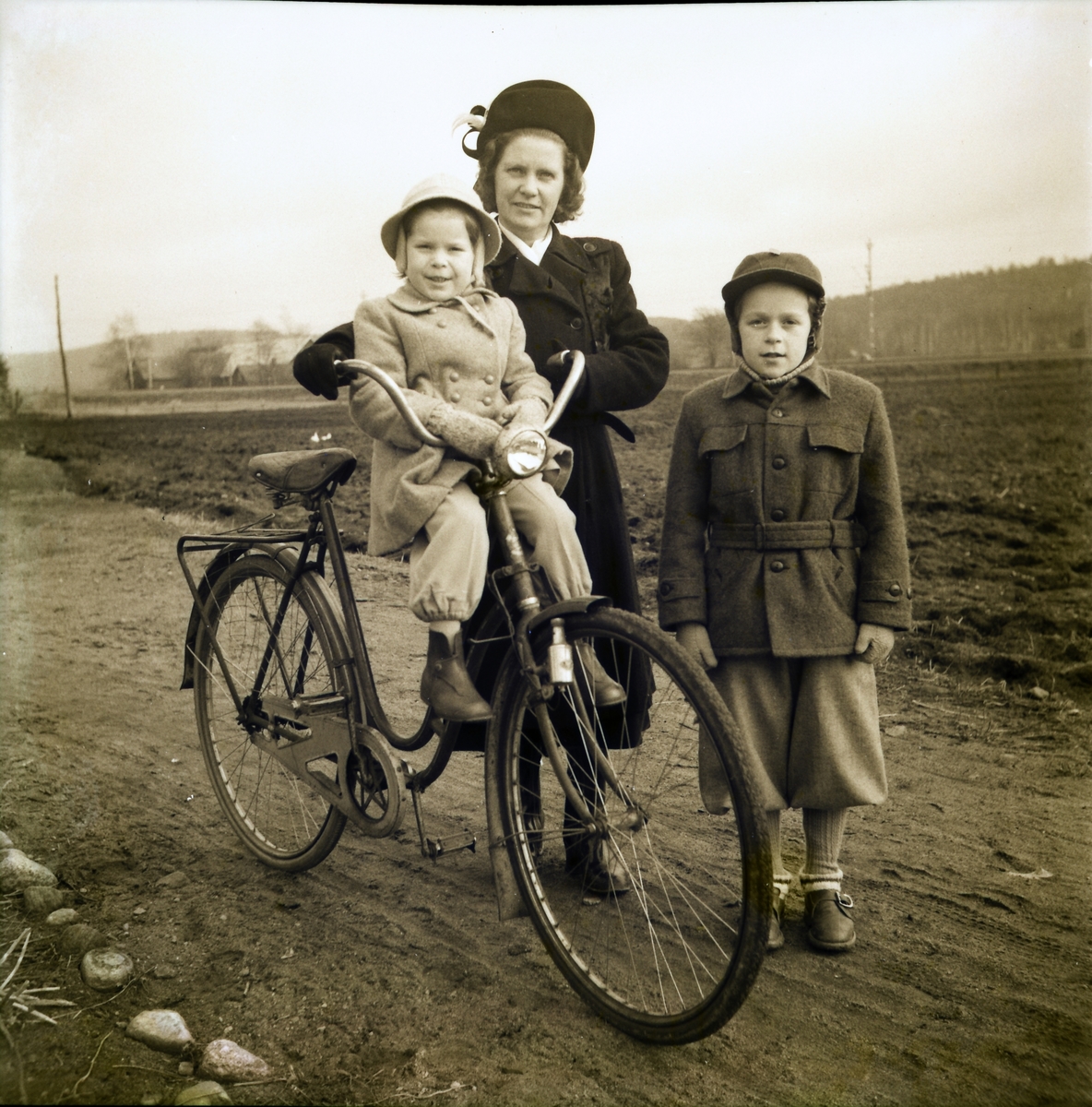 Jenny Lidberg på promenad med cykeln och barnen. Lilla Elly sitter på en extra sits monterad bakom styret och Leif går bredvid. De är klädda för en kylig dag med öronlappsmössor, varma jackor och vantar.